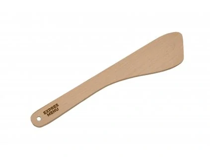Buková obracečka o délce 26 cm má na jedné straně vygravírované logo EXPRES MENU a na druhé slogan „S chutí do toho, hned je hotovo” společně s reliéfem Krkonoš - domovem EXPRES MENU. K nákupu nad 5500 Kč dostanete obracečku jako dárek.