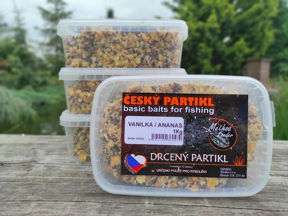 Partikl drcený vařený. Tato směs je výsledkem přípravy ze zrn kukuřice, řepky a pšenice, které se tepelně upravují a následně drtí. Směs zůstává ve vlastní šťávě, což je ta nejlepší cesta pro nalákání ryb na lovné místo. Přidáním příchutě do drceného partiklu se zvyšuje jeho atraktivita. Krmné koberce i mraky lákají svou uvolňující se vůní. Použít se dají i jako přísada do krmných směsí, method mixů nebo přímo do krmítka. Doporučené skladování originálního balení je do 20 °C a spotřeba do 12 měsíců od zakoupení. Po otevření je doporučené drcený partikl co nejdříve zpracovat a uchovávat v chladu či zamrazit.